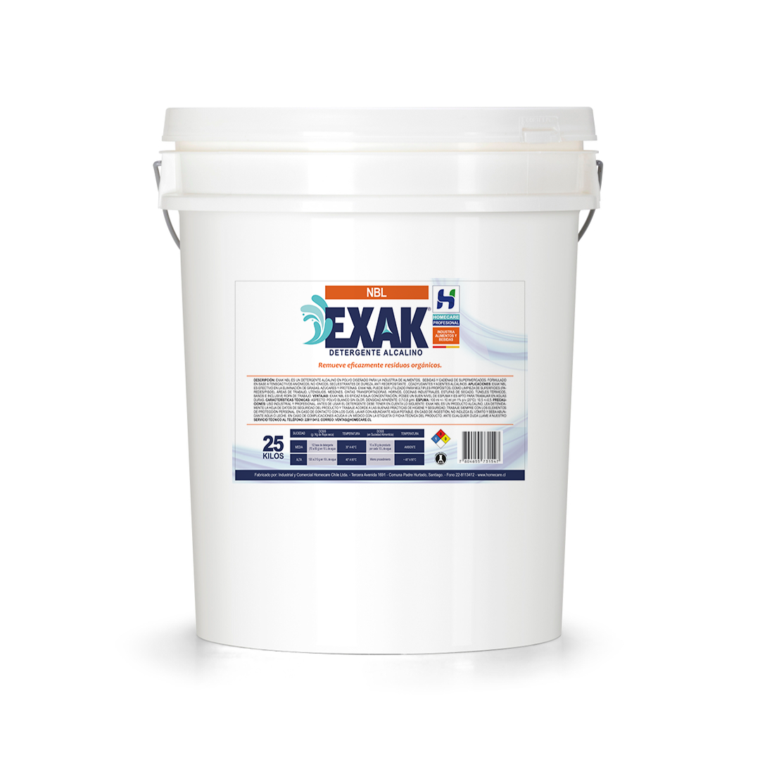 Exak NBL: es un detergente alcalino en polvo diseñado para la industria de alimentos, bebidas y cadenas de supermercados. Formulado en base a tensoactivos aniónicos, no iónicos, secuestrantes de dureza, anti redepositante , coadyudantes y agentes alcalinos.