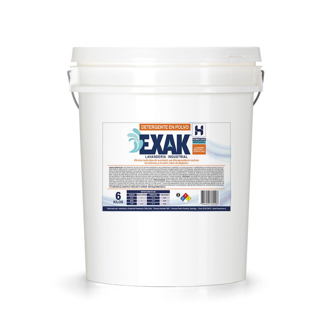 EXAK® DETERGENTE EN POLVO [BALDE DE 6 KGS]: descripción: detergente en polvo de óptima apariencia, baja densidad y humedad, alta solubilidad y homogénea distribución de sus activos, para el prelavado y lavado de textiles en lavanderías industriales, comerciales e institucionales, indicado para niveles de suciedad medio-alto en prendas blancas y de color, de algodón y algodón/poliéster. producto formulado en base tensoactivos aniónicos, no iónicos, alcalinizantes, abrillantadores ópticos, secuestrantes, antidepositantes, reguladores de ph, todos de gran solubilidad y biodegradabilidad, ya que no contienen fosfatos. aplicaciones: puede ser utilizado en todo tipo de lavanderías comerciales (hoteles, restaurantes, etc) y es un producto recomendado con excelencia para lavanderías clínicas hospitalarias.